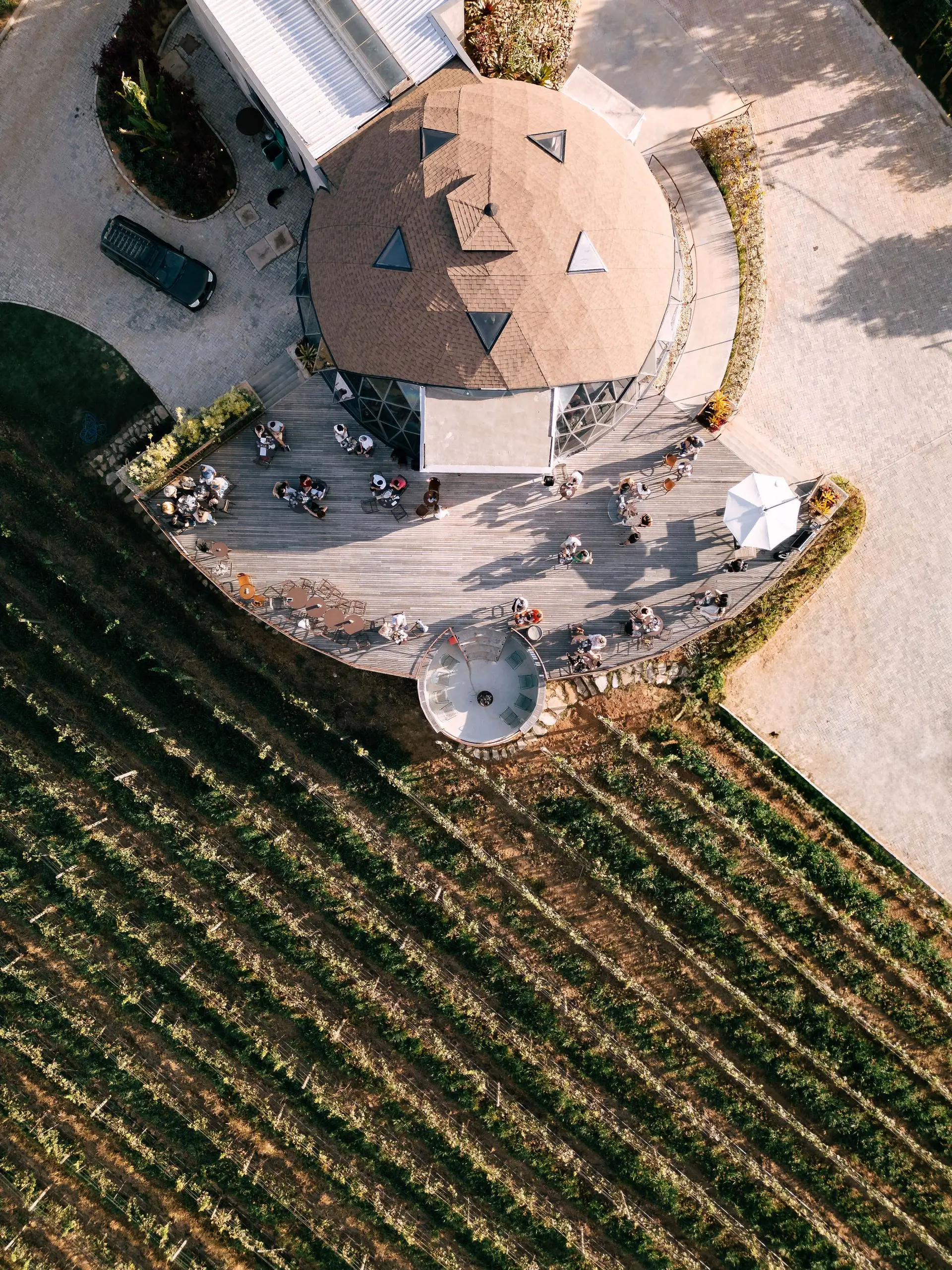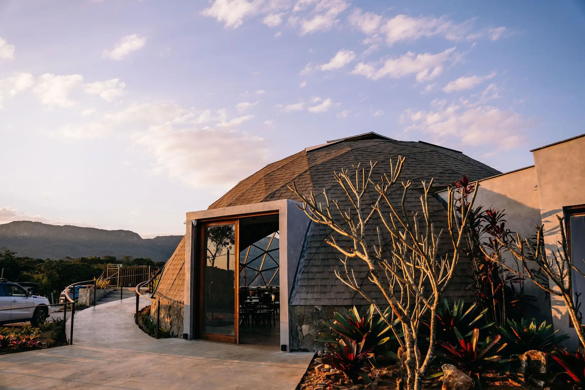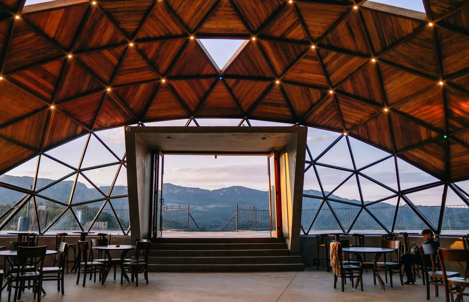 Em um projeto singular, o Domo Geodésico avança sobre o parreiral e abre o portal para a belissíma Serra de São José, equilíbrio entre um projeto arquitetônico arrojado e o cenário de beleza natural único.